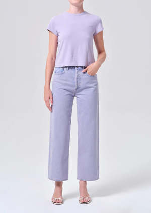 AGOLDE's Ren jeans from the Weightless Collection offer a high-rise waist and cropped wide legs for a relaxed yet flattering silhouette. The lightweight fabric ensures all-day comfort, making them ideal for casual wear. Pair them with a half-tucked tee for a cool, effortless look. - This fit is true to size. - Looks like: medium lavender with heavy fading and whiskering - Feels like: weightless, zero-stretch denim cotton with a soft hand for an easy drape MORE DETAILS - Closure: button fly - Rise: 12 1/4" - Inseam: 27 1/2" - Leg opening: 19 1/2" - Model is 5'10" and is wearing a size 27 - Fabric: 100% regenerative cotton Care Instructions: - Machine wash cold inside out with like colors. - Do not bleach. - Tumble dry low. Made in Turkey with imported materials.