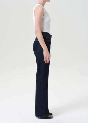 Designed to elongate and flatter, the Leena features a high rise and full-length flare that hugs through the hip before subtly kicking out. Crafted from rigid, non-stretch regenerative cotton denim with a soft hand, and finished in a medium indigo with marbled fading, whiskering, and a raw hem. Style with a sleek tank or tonal denim top for a clean, head-to-toe look. DETAILS - Closure: Zipper Fly - Rise: 11 3/4" - Inseam: 33" - Leg Opening: 19" - Model is 5'10" and is wearing a Size 27 - Fabric: 100% Regenerative Cotton