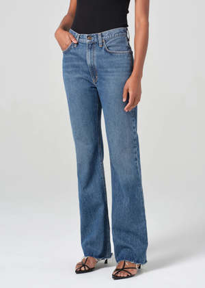 The Leena is a high-rise baby flare jean that combines a modern and vintage-inspired fit. Crafted from regenerative cotton, it features a flattering cut-off hem and traditional five-pocket detailing. Made in vintage medium to dark indigo denim, with fading, whiskering, and a raw cut hem, this jean has a beautifully draped fabric that adds effortless style to any look. Looks like: Vintage medium to dark indigo denim with fading, whiskering, and a cut hem. Feels like: Rigid, non-stretch blend of regenerative and recycled cotton with a soft hand feel. 67% Regenerative Cotton, 22% Lyocell, 11% Post Consumer Recycled Cotton. Machine wash cold inside out with like colors. Do not bleach. Tumble dry low. Made in Turkey with imported materials. This fit is true to size. Closure: Zipper fly Rise: 11 3/4" Inseam: 33" Leg opening: 19" Model is 5'10" and is wearing a size 27.