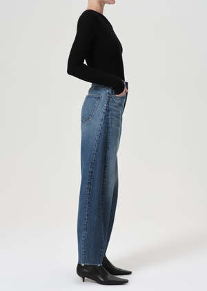 AGOLD Luna Pieced Jean Split Structured to perfection. The Luna is designed with a waist-accentuating high-rise and a full-length relaxed leg. The pieced insert detailing at the out seam creates a bowed leg silhouette, ideal for taking your everyday denim to the next level. Composition: 67% Regenerative Cotton 22% Recycled Lyocell 11% Post consumer Recycled Cotton Color: Split Two toned medium to Dark Indigo Fit: Cotton blend with a hint of stretch for all day wearability True to Size