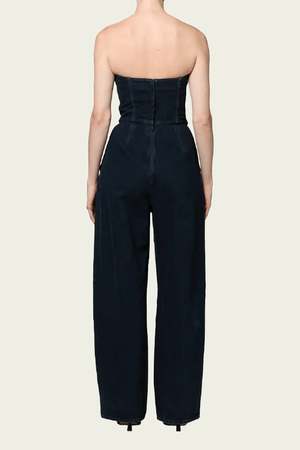 Show off your shoulders in this dark-wash denim jumpsuit made with pronounced topstitching and finished with leg-elongating wide hems.