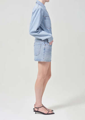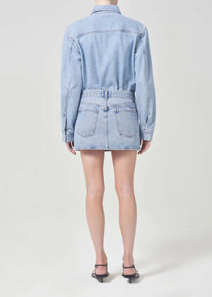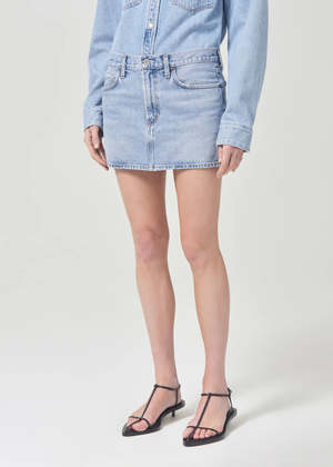 Agolde Alek mini denim skirt in force light blue wash. Crafted in Agolde's signature regenerative cottonAlek is the new coveted mini, featuring the classic 5-pocket detailing and a closed hem. Zero stretch cotton with an authentic vintage hand. 100% regenerative cotton.