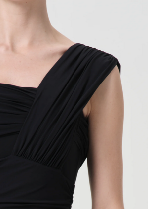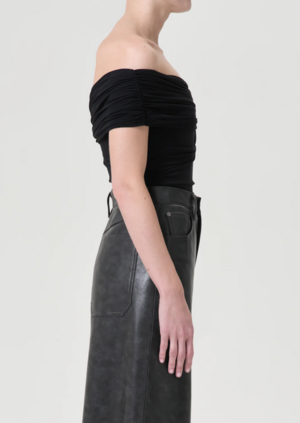 Color: Black 73% Polyamide, 27% Elastane Fit: True to size | Fitted | Draped off-the-shoulder neckline Care: Machine wash cold inside out; Tumble dry low Made in the States