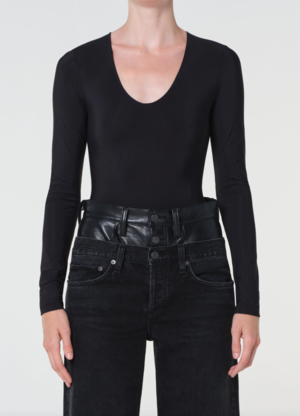 A long-sleeve scoop neck bodysuit in a lightweight, second-skin elastane blend. True to size, it offers a smooth, ultra-clean fit that layers effortlessly or stands alone. In black, it's a minimalist essential with a modern, sleek edge. Looks Like: True black long sleeve scoop neck bodysuit Feels Like: Lightweight second skin ultra-smooth elastane blend 73% Polyamide, 27% Elastane Machine wash cold inside out with like colours. Do not bleach. Tumble dry low. Made in USA with imported materials. This fit is true to size. Model is 5'10" and wearing a size Small.