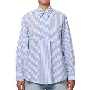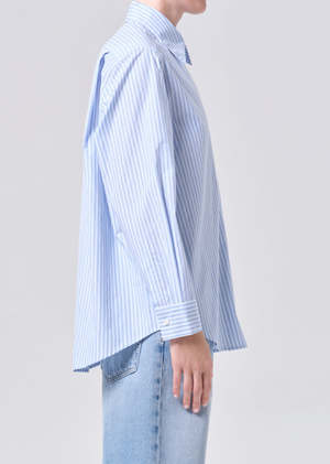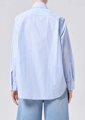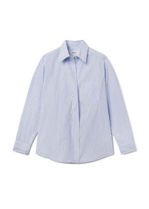 The Aris Shirt is cut in a relaxed silhouette with a classic collar and subtle dropped shoulder. Crafted with an ultra-lightweight feel, it drapes effortlessly with a refined, menswear-inspired blue-and-white stripe. Style loosely over denim or half-tucked into tailored trousers for an easy, pulled-together look.