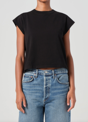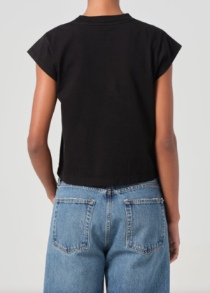 When you need more than just a basic tee, meet the Bryce. Crafted from 100% breathable, ultra-soft cotton, it's perfect for wearing solo or layering. The angled sleeves add a modern touch, creating a fresh and flattering silhouette that effortlessly elevates any look. Looks Like: Stark black crewneck tee with cap sleeves Feels Like: Lightweight jersey with an easy drape for all day wearability 100% Cotton Machine wash cold. Made in USA with imported materials. Measurements: Body Length: 21 1/4" Shoulder to Shoulder: 15 1/2" Sleeve Length: 3 1/2" Chest: 38" Sweep: 39" Model is 5'10" and wearing a size Small.