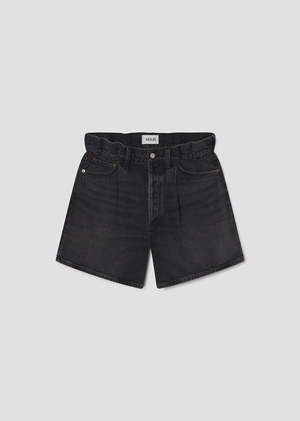 The Lyonne Short is a high-rise silhouette designed with a soft, cinched waistband and subtle elastic stitch detailing for added comfort. Crafted in a dark worn-in black denim, it features a straight-leg shape and a clean finish hem that creates a flattering, leg-elongating line while maintaining a relaxed, effortless feel. Made from non-stretch, weightless regenerative cotton denim washed down for a super soft feel, this pair drapes lightly while keeping its structure throughout the day. Looks Like: Dark worn-in black denim short with cinched detailing at the waistband. Feels Like: Non-stretch, weightless denim washed down for a super soft feel. Fabric: 100% Regenerative Cotton Machine wash cold inside out with like colours. Do not bleach. Tumble dry low. Made in Turkey with imported materials. Measurements: This fit is true to size. Closure: Button fly Rise: 13 1/2" Inseam: 4 1/4" Leg Opening: 27 1/2" Model is 5'10" and is wearing a size 27. Type: Denim