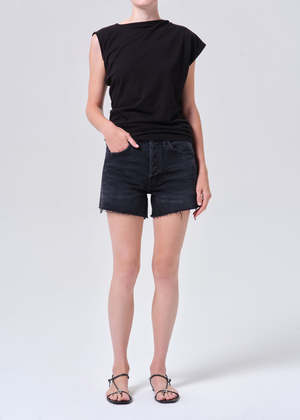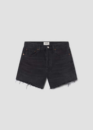 The Parker Long shorts are crafted from non-stretch, regenerative cotton in a saturated black denim wash, complete with subtle whiskering for a lived-in look. With a relaxed high-rise and ample room in the thighs, these shorts offer both comfort and effortless style. Looks Like: Saturated black denim short with whiskering Feels Like: Rigid, non-stretch cotton denim with a soft hand for all-day wearability Closure: Button Fly Rise: 11 1/4" Inseam: 4 1/2" Leg Opening: 24 1/2" Model is 5'10" and is wearing a Size 27. Type: Bottoms