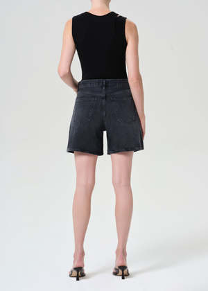 The Dame Short is crafted from washed black denim with subtle whiskering, giving it a worn-in feel. Featuring a high-rise fit, relaxed silhouette, and wide leg opening, these shorts offer a balance of comfort and style. The clean hem adds a polished touch. This fit is true to size. Looks Like: Washed black denim short with whiskering and clean hem Feels Like: Rigid, non stretch cotton denim with a soft hand for all day wearability Closure: Button Fly Rise: 12" Inseam: 6" Leg Opening: 25 1/2" Model is 5'10" and is wearing a Size 27 Fabric: 100% Regenerative Cotton Care Instructions: Machine wash cold inside out with like colors. Do not bleach. Tumble dry low. Type: Bottoms