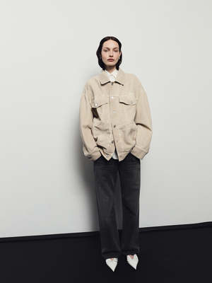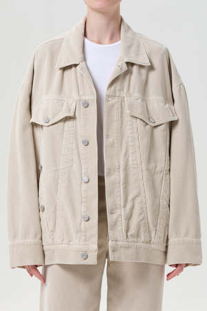 Agolde reworked corduroy Wayne workwear jacket in Rice Grass light beige. Oversized and tactile, the silhouette adds a laid-back look. Super soft and luxe textured corduroy. 100% cotton. Length 30 inches. Made in the USA. A5111-1840