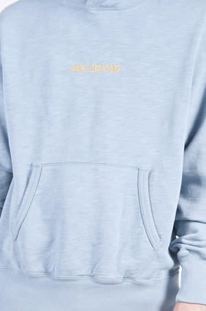 100% Cotton. Made in Canada. The Kanga Hoodie is constructed in Canada from a lightweight slub cotton terry. Features 'Aim Leon Dore' embroidered in gold thread at chest, kangaroo pocket, ribbings at cuffs and hem, and double layered hood.