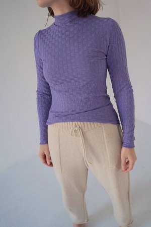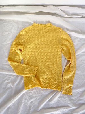 Checkered knit design in 100% pima cotton. Features a 1 high funnel neck, rolled hem finishes and a buttery soft feel. Burnt yellow 100% cotton machine wash inside a mesh bag or on delicate cycle. Lay flat to dry. Knitted in Peru Size and Fit View Measurements Model is 57 and wearing a US size XS/S. Her measurements: 34 Chest, 27 waist, & 39 hip. Fits true to size