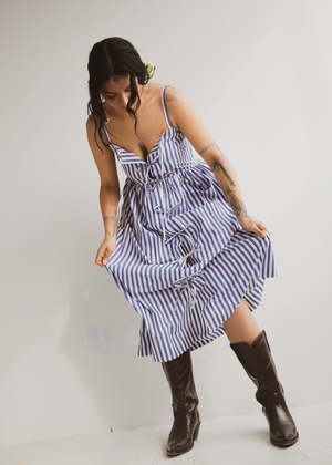 |PRE-ORDER| Orders close April 1st, 2022. Ships early May. Ankle-length dress featuring a gathered skirt, semi-sweetheart neckline, smocked back, adjustable spaghetti straps, full front tie closure, and one patch front pocket. Cut in 100% shirting cotton, this fabric is light and structured. The dress was designed with a 1" overlap at the front closure for coverage during movement. Please note, sizes L-XL will have a 1" wide strap to offer extra support. White and blue 100% cotton tie closure and smocked back Wash cold with like colors and hang to dry Made in India Size and Fit Maelis is 57 and wearing a US size small. Her measurements: 34D bust, 30 waist, & 42 hip. Follow your own measurements to choose the size in the chart below. This dress stretches 2-4 inches comfortably around the torso and chest. Petite sizing is recommended for heights 4'9-5'4 Dress measurements are taken from the neck to the hem Size Length Waist Chest Hip XS 51 1/2 24-26 32 34-38 XS Petite 46" 24-26 32 34-38 S 52 1/2 27-30 34 39-43 S petite 46 27-30 34 39-43 M 53 31-34 36 44-49 M Petite 46 31-34 36 44-49 L 53 1/2 35-38 38 50-54 XL 53 1/2 39-42 42 55-60 XXL 53 1/2 43-47 44-46 60-65 Non-stretchy fabric but the bodice is stretchy due to the smocked back and the skirt is a gathered skirt therefore very roomy. fits true to size. Feel free to size up for a more relaxed fit around the chest. It can easily be tailored for a more fitted waist.