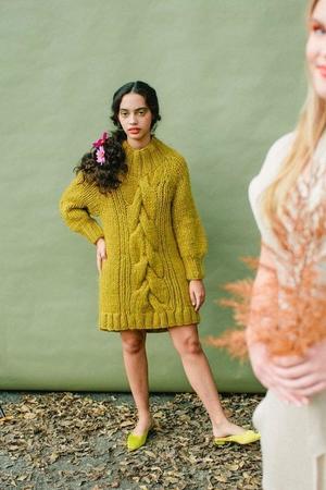 the ajaie alaie les amis tunic is a cable-knit sweater featuring a ribbed funnel neck, semi billowy sleeves, ribbed cuffs and hem. it can be worn as a tunic over pants or leggings, or it can stand alone as a mini dress. the les amis tunic runs true to size, and is 100% alpaca. we recommend gentle wash + lay flat to dry or dry clean. ajaie alaie garments are ethically-made by hand in small batches in peru and india. gabby is 5'2" wearing a small. brittany is 5'7" wearing a medium.