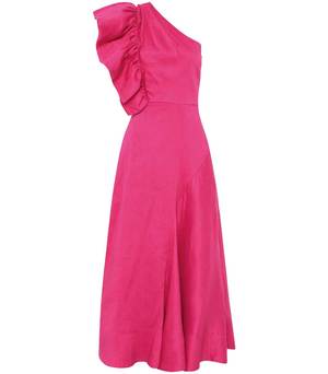 The Bonjour Asymmetric Midi Dress in Fuchsia by Aje is a one shoulder, midi length dress featuring a frill sleeve with organza layers, flared skirt, and wide hem with top-stich detail. - Invisible zipper at left side seam. - 69% Linen 31% Viscose - Dry Clean Only