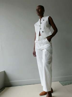 The Miriam Panel Pants by AKIRANAKA are a sculptural interpretation of the brands iconic trousers. Designed with precise cutting, they maintain a clean line through the waist and hip while introducing architectural volume through panelled seams. The silhouette is complete with side pockets and two generously sized patch pockets on the rear. Made in Japan. Fabric: 75% cotton, 25% linen. Yolonda is 510" with a bust measuring 35 inches, a 27 1/2 inch waist, and 39 1/2 inch hips, and is wearing size 2.