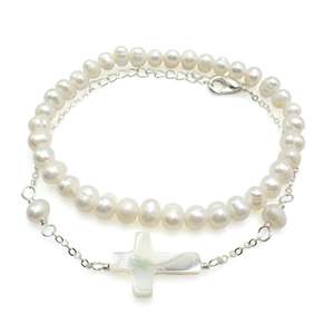 This two-piece bracelet set features a 6 3/4 inch stretch freshwater pearl bracelet and a silver cable chain bracelet with freshwater pearls surrounding a mother of pearl cross that adjusts from 6 3/4 to 8 1/4 inches with a lobster clasp and extender.
