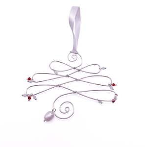 This swirling and looping tree ornament is designed and hand formed by our artisans. White and red faceted crystals dangle from the loopy branches, and a freshwater pearl finishes this ornament. Perfect package topper! 4 inches wide and 3 1/2 inches tall. Style 170226.