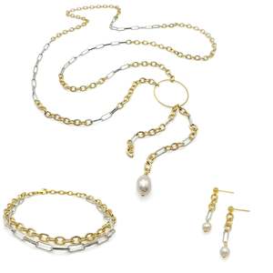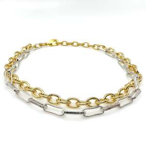 A chunky gold-plated cable chain is paired with silver-plated paperclip chain for a fun new addition to our charm bar. Wear it with charms fastened in the paperclip chain or wear it alone. Adjustable to 8 1/2 inches.