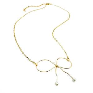 A 1 1/2 inch gold plated bow with white majorca pearls on each end is suspended between gold plated cable chain to create a 16 inch necklace with a lobster clasp and 3 inch extender chain. Complete your look with the matching With a Bow earrings and bracelet.