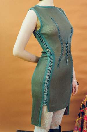 Sleeveless mini dress with standout blue trims bordering the dress and stitching along both sides with a visible gap for added allure. Fitted with stretch and cinched at the waist with stitch details on the front. Features an asymmetrical hem with a shorter length in the front and longer length in the back. Made from a rayon material that is smooth to the touch, knitted in a local knit factory producing football scarves and uniforms based in Cyprus, and hand stitched together in Alex Hadji's London studio. Since the fabric is loosely knitted and hand stitched together, please be careful to not snag or fray when wearing. Started in July 2025 and completed in August, the Trikko Mini Dress is a work of art from conception to production. Measurements (laying flat and indicates stretch): Size Small: Bust 33-44, Waist 27-36, Hip 31-40, Length 39, Shoulder 15 Size Medium: Bust 35-46, Waist 29-38, Hip 33-44, Length 40, Shoulder 15 Material: Silk and cotton. Dry clean only. Knitted in Cyprus, hand stitched together in London.