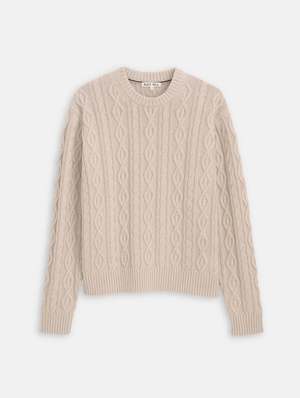 A traditional cable knit sweater. Details - Breezy cotton cable knit with mixed cable sizes and rib detailing between cables. - Relaxed fit, slight drop shoulder. - Contrast chain stitching inside neck. Size + Fit - True to size. - Joao is 6'3" and wearing a size medium. Composition - 100% cotton. - Hand wash cold with like colors using non-toxic detergent. No bleach. Dry flat.