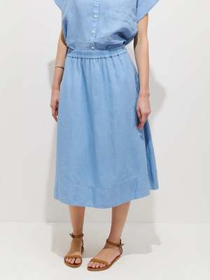 A skirt that has phone-sized pockets. The Maddie Skirt is a midi length skirt with an elastic waistband for comfort. This skirt has just the right amount of volume with a lightweight feel. Darling paired with the coordinating Maddie Shirt in Linen or anything as simple as a tee or tank. - 100% linen - Fit: Fitted at the waist with a slight flare - Made from 100% linen, garment-dyed for vibrant color - On-seam pockets are less bulky than other kindsflattering and functional - True to size - Model is 5'10" and wearing a size small - Size small measures 27" around the waist and 29.5" long; bottom opening measures 68"