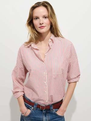 The perfect oversized cotton blouse in all the right proportions. Crafted with the perfect amount of volume and length without being too bulky. Features a front pocket and side slits. - 100% cotton - Runs true to size with an oversized fit - Size small measures 46.25" around the chest and 27" long. Sleeve length measures 31.25" from the neck.