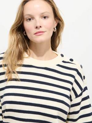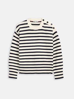 A classic cotton crewneck sweater with a nautical twist. - 7-gauge knit (needle size) with two endstwo yarns twisted together for the perfect in-between weight - Custom-dyed yarn - Contrast chain stitch at the interior - Fashioning at side seams and sleeves for a soft, curved shape - Nautical buttons, hand-linked and hand-finished throughout - 100% cotton. - Hand wash cold using non-toxic detergent. Lay flat to dry.
