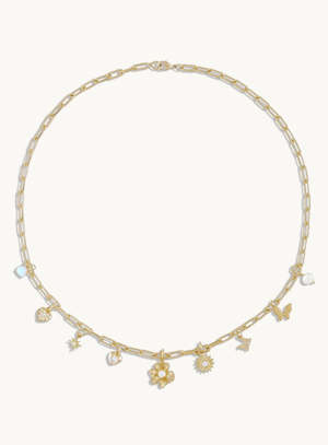 This 18k gold filled link chain necklace features 9 custom charms. It is very lightweight and has a lobster clasp closure. The necklace is gold filled, meaning it has a much thicker layer of gold wrapping around its base metal than gold-plated jewelry. This thicker layer makes the jewelry more durable and able to withstand daily wear and tear. It is recommended to keep your gold filled jewelry away from oils, perfumes or other chemical substances that may cause them to tarnish. Necklace Length: 18" Please Note: The photos shown are examples and charms will vary from necklace to necklace.