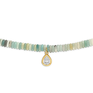 This necklace features 6mm aqua and natural tone amazonite beads with a gold filled bezel CZ pear pendant and lobster clasp closure. It can be worn on its own or layered with other Alexa Leigh necklaces for a personalized look. The necklace measures 18 inches in length. Materials: 6mm aqua and natural tone amazonite beads, gold filled bezel CZ pear pendant (15mm x 9mm). Care: Alexa Leigh jewelry is designed for everyday wear. While you may swim, shower, exercise, and sleep in it, doing so may shorten the life of your jewelry. Avoid direct contact with perfume, hairspray, lotion, and other harsh chemicals to prevent tarnishing.