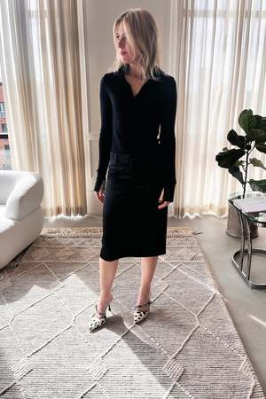The Erin Skirt by Alfie features a low rise and straight fit with a mid-length hem. Color: Black Fabrication: Viscose Fit Notes: This skirt runs true to size.