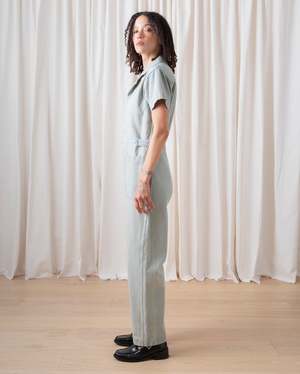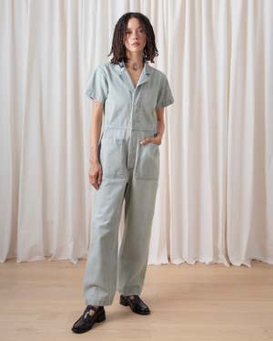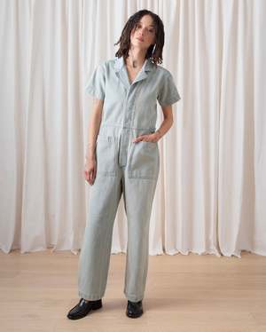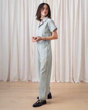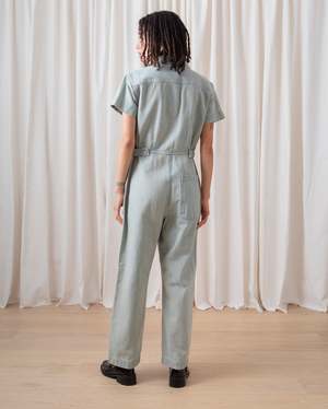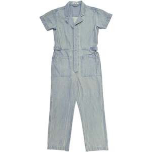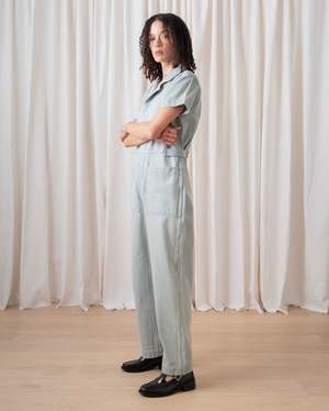 Classic short sleeved boiler suit buttons up front with hidden placket, notch collar and front patch pockets. Includes side tabs with buttons for synching waist. Pre-washed + pre-shrunk. CONTENT + CARE: 100% Cotton Denim Machine wash cold, lay flat or hang to dry MEASUREMENTS: XS - Waist: 32", Hips: 37", Inseam: 27.5" S - Waist: 35", Hips: 39", Inseam: 27.5" M - Waist: 37", Hips: 41, Inseam: 27.5 L - Waist: 38", Hips: 42, Inseam: 27.5