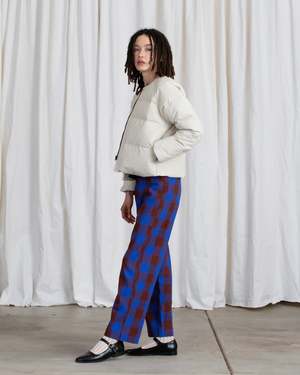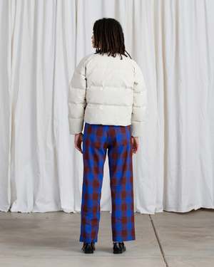 Raglan quilted collarless jacket with side seam pockets and inside hidden pocket. Hidden center zipper with snaps at collar and hem. Made with love in a Fair Trade Certified facility in China. - Exterior: 75% Cotton, 25% Nylon - Filling: 80% Down/20% Feather - Lining: 100% Polyester SIZE CHART(laying flat): SMALL: Chest 22.5", Length 22.5", Sleeve length 29", Bottom Opening 21" MEDIUM: Chest 23.25", Length 23", Sleeve length 29.5", Bottom Opening 21.75" LARGE: Chest 24.25", Length 23.5", Sleeve length 30.25", Bottom Opening 22.75"