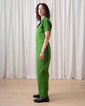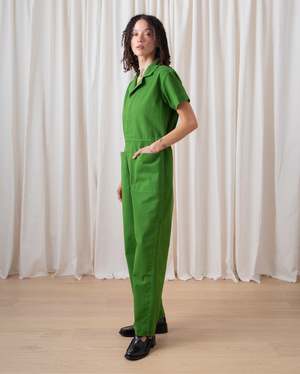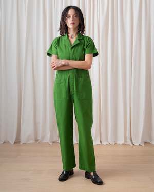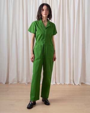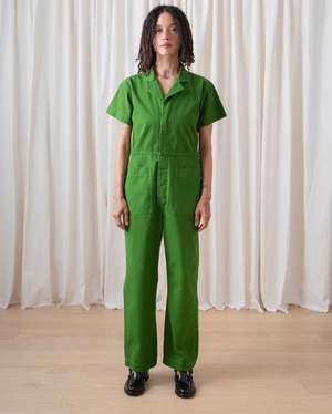 Classic short sleeved boiler suit buttons up front with hidden placket, notch collar and front patch pockets. Includes side tabs with buttons for synching waist. Pre-washed + pre-shrunk. Same fabric as our new overalls :) CONTENT + CARE: 100% Cotton Machine wash cold, lay flat or hang to dry MEASUREMENTS: XS - Waist: 32", Hips: 37", Inseam: 27.5" S - Waist: 35", Hips: 39", Inseam: 27.5" M - Waist: 37", Hips: 41, Inseam: 27.5 L - Waist: 38", Hips: 42, Inseam: 27.5