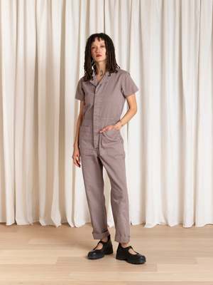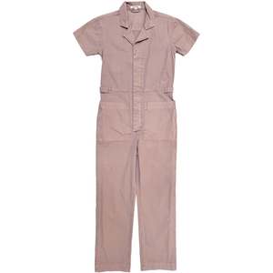 Classic short-sleeved boiler suit in soft over-dyed organic cotton. Buttons up the front with hidden placket, notch collar, and front patch pockets. Includes side tabs with buttons for cinching the waist. Pre-washed and pre-shrunk. CONTENT + CARE: 100% Cotton Machine wash cold, lay flat or hang to dry MEASUREMENTS: XS - Waist: 32", Hips: 37", Inseam: 27.5" S - Waist: 35", Hips: 39", Inseam: 27.5" M - Waist: 37", Hips: 41", Inseam: 28" L - Waist: 38", Hips: 42", Inseam: 27.5" L - Waist: 39", Hips: 43", Inseam: 28.5" May is wearing size S.
