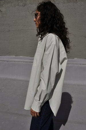 Oversized button-down shirt with collar and buttons at sleeve. 100% Cotton MEASUREMENTS (laying flat) XS - Chest: 25", Length: 28", Shoulder to Shoulder: 21.5" S - Chest: 26", Length: 29", Shoulder to Shoulder: 22.5" M - Chest: 27", Length: 30", Shoulder to Shoulder: 23" L - Chest: 28", Length: 31", Shoulder to Shoulder: 23.5"