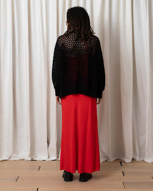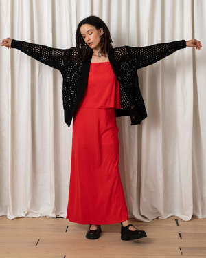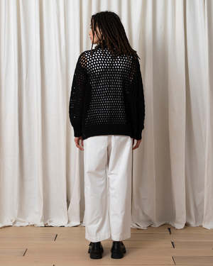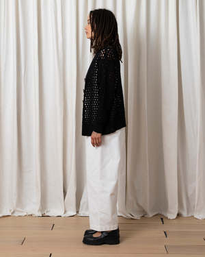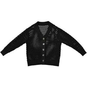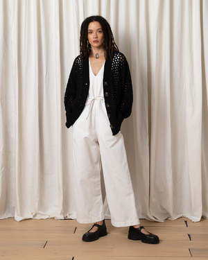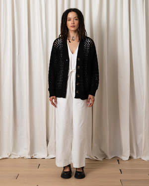 Open knit slightly oversized cardigan sweater with oversized buttons. MEASUREMENTS (laying flat): XS/S - Chest: 24, Length (Shoulder to hem): 22, Sleeve Length 20", Bottom Width: 20 M/L - Chest: 26, Length (Shoulder to hem): 23.5, Sleeve Length 20", Bottom Width: 22" CONTENT & CARE: 100% Cotton Dry clean -or- hand wash cold & lay flat to dry