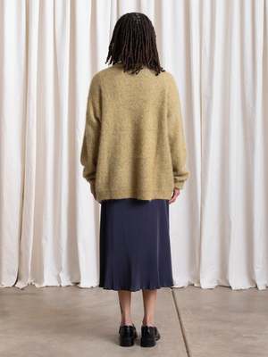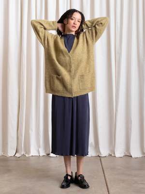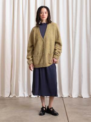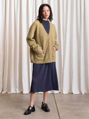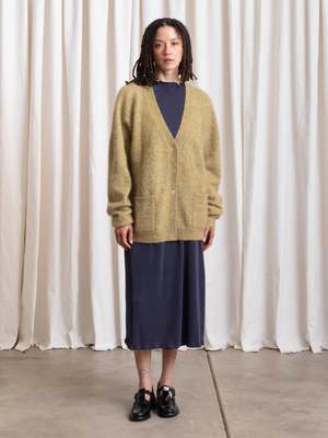 Oversized cardigan V-neck sweater in the softest Mohair yarn blend. CONTENT & CARE: 33% Mohair, 33% Wool, 28% Nylon, 6% Spandex Dry clean MEASUREMENTS (laying flat): XS/S - Chest: 24.5, Length (Shoulder to hem): 28, Shoulder to Shoulder: 22" XS/S - Chest: 27, Length (Shoulder to hem): 29, Shoulder to Shoulder: 24"