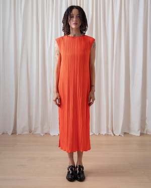Simple high neck tank dress in pleated fabric with side slit. Keyhole button closure at center back. CONTENT & CARE: 100% Recycled Polyester Dry clean -or- hand wash cold & hang or lay flat to dry