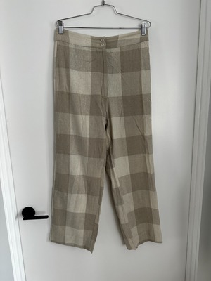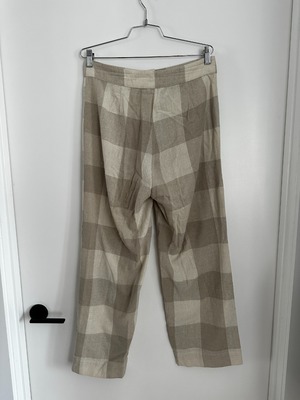 Ali Golden neutral plaid raw silk pant. Straight leg fit with a double button and zipper fly.