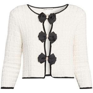 The Akira Bow Knit Cardigan by alice + oliva features a cropped, hip-length silhouette with front hook closures and a scoop neck. Fabric: 61% Viscose, 20% Cotton, 12% Nylon, 3% Polyester.
