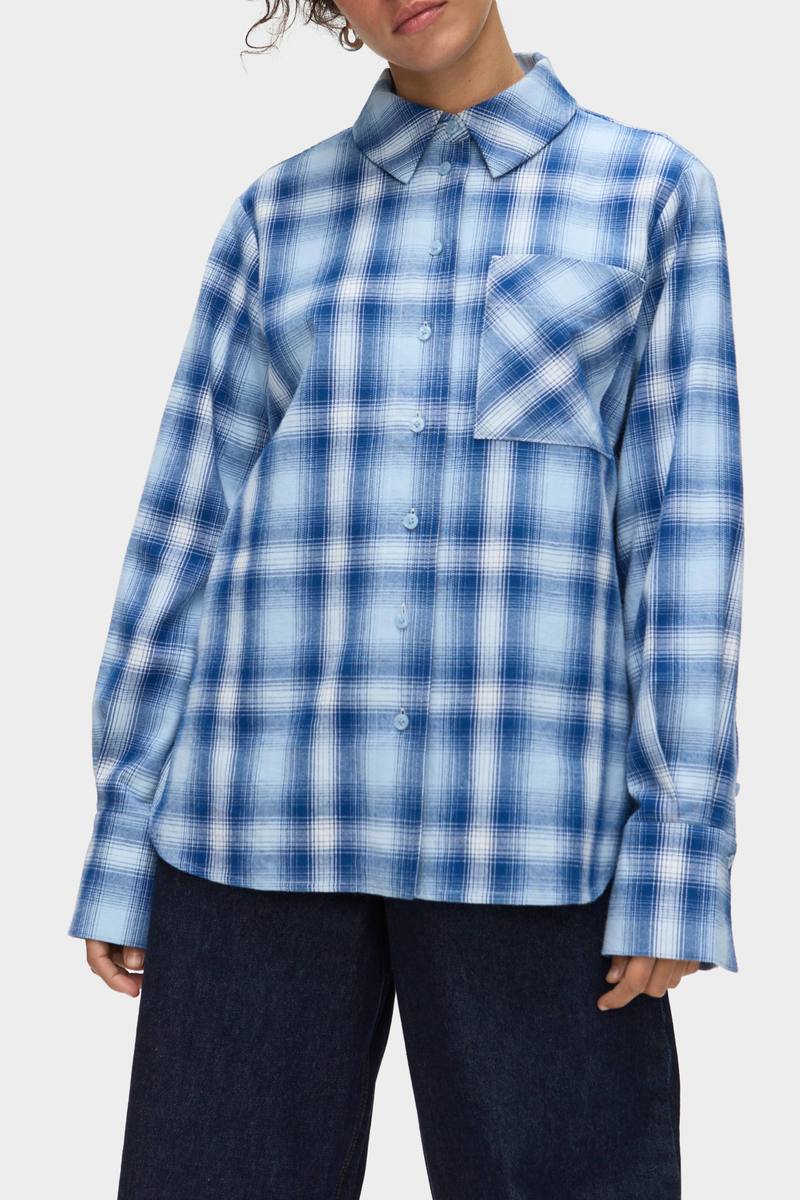 A relaxed take on classic shirting, this check flannel shirt is crafted from soft, lightweight fabric for all-day comfort. Designed with a slightly oversized fit, it features a button-down front, pointed collar, and a statement chest pocket with contrasting check placement. Easy to style and endlessly versatile, it layers effortlessly or works as a standalone piece for a laid-back, modern look. Material: 100% Cotton. Made in China. Adjustable buttons at the back allow for a more fitted look.