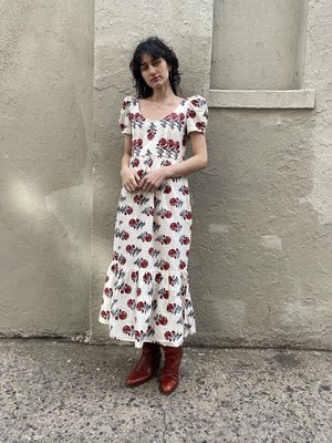 Cap sleeve, full gathered skirt and ballet neckline. Hand printed textured cotton, top is hand pleated and hand embroidered with pink thread. Small measures laying flat Shoulder 17" Waist 17" Length 51" Hand wash cold Made in Jaipur