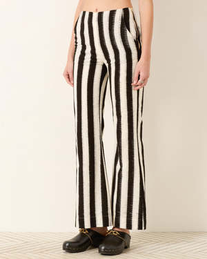 Graphic and timeless, the Charlie Coal Stripe Pant by Alix of Bohemia brings refined ease to everyday dressing. Cut from richly textured ikat cotton, the black-and-white stripe feels both artisanal and modern, finished in a silhouette that flatters and elongates. - Crafted from handwoven ikat cotton with natural texture and depth - Slim through the hip with a softly flared leg for balanced proportion - Mid-weight fabrication fully lined in soft cotton voile for comfort and coverage - Side zipper closure for a clean, streamlined finish - True to size, size up if between sizes 100% Cotton. Imported.