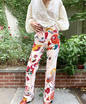 Slim waist flared silhouette, high-rise contrasting banded waist. Unlined 100% cotton velvet floral printed zip and hook fastening. Dry clean Made in Jaipur