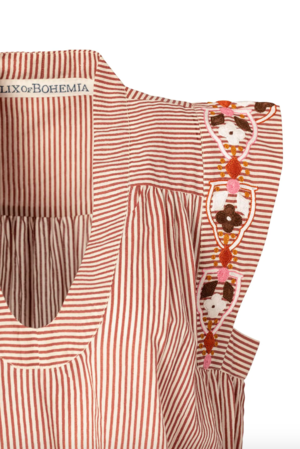 Sleeveless top rendered in hand printed cotton stripe, the Nehru has an easy fit, finished with hand embroidery along the edges of the shoulders. This textile has been printed and embroidered by hand, using traditional methods. Subtle printing and dye variations will occur in this fabric. These are part of the natural beauty and character of the hand making process, and the signature of the maker's hand.