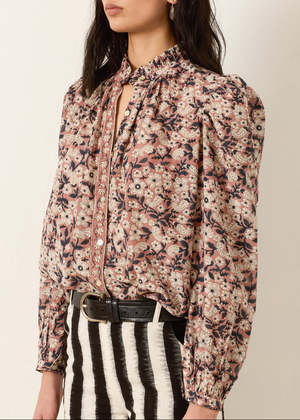 Romantic and free-spirited, the Annabel Sepia Floral Shirt from Alix of Bohemia pairs vintage-inspired florals with a breezy, artisan feel. - Classic frill-collar neckline with a relaxed button-front placket - Long sleeves with buttoned cuffs and subtle gathering - Hand-block printed Sepia Floral motif - Gently curved hem for easy tucking or flowing wear - Each piece is hand-finished, making every shirt unique - Relaxed fit, true to size for an effortless drape. 70% Cotton, 30% Silk. Imported.