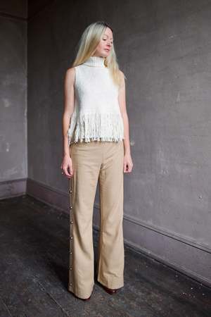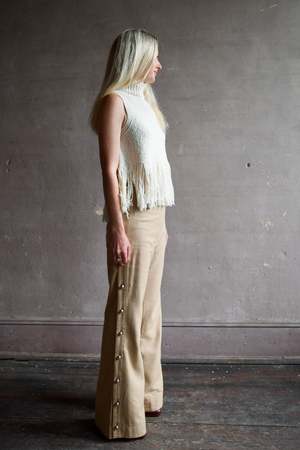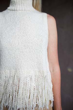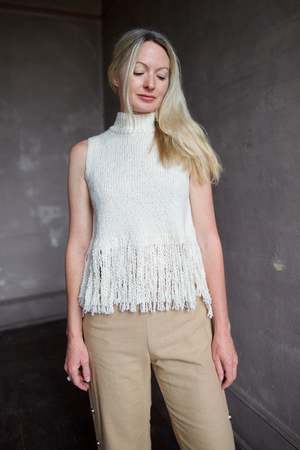 Experience the perfect fusion of textural artistry and modern design with this sleeveless mock neck sweater from Alix Of Bohemia. Crafted from 100% premium ultra-soft cotton, this top features a distinctive fringe hem for added movement and visual interest. The sophisticated cream 'White Snow' colorway serves as an elegant neutral foundation for versatile styling across seasons. Expertly made in Peru, this piece showcases superior craftsmanship and attention to detail. - 100% premium ultra-soft cotton for exceptional softness and breathability - Distinctive fringe hem adds bohemian-inspired texture - Sleeveless mock neck silhouette for elegant coverage and layering versatility - Made in Peru with expert knitting construction A versatile luxury essential, perfect for layering or standalone styling.