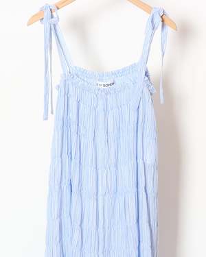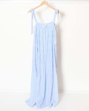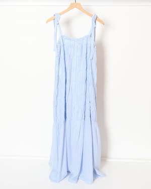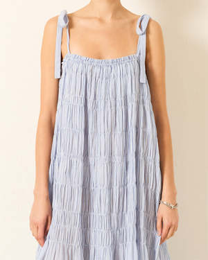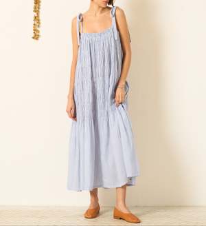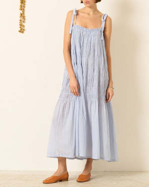 This dress by Alix of Bohemia is handmade from breathable cotton in soft sky-blue stripes. It features a relaxed midi silhouette with gathered tiers for graceful movement and hand-finished touches that reflect the brands artisanal roots. 100% Cotton. Imported.